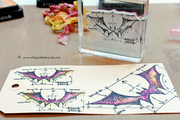 Another technique Tim used on his tag was to put brads down to hold your words or, in my case, numbers. I like how this looks too! My bats were stamped in jet black archival ink and then watercolored with distress inks!