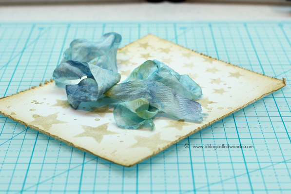 There's a whole lot going on here!! I was thinking to myself…maybe it's a bit much? But I kept going anyway! Here's a close up of the dyed-to-match ribbon and some tattered floral flowers covered in rock candy glitter! I made my own saying using the tiny word stickers and put them on a stick pin….