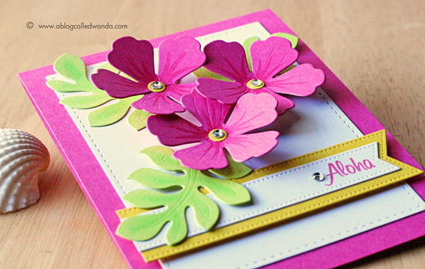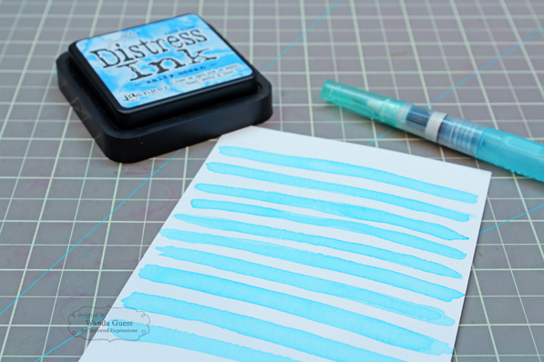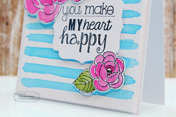 For the bee I cut out an extra set of wings and layered them on top of each other. The lower set is glued on to the back of the main die cut. I added some pretty yellow honeycombs for our sweet bee to hang out on. Using all shades of yellow Distress Inks and dies: Wild Honey, Lemonade and Mustard. I also used lots of Corduroy Distress Ink. The bee and the honeycombs are watercolored with the Distress Inks. The ribbon was dyed using the Distress Stains in the same shades. the flowers are Worn Lipstick Ink.