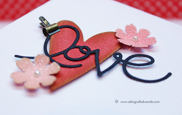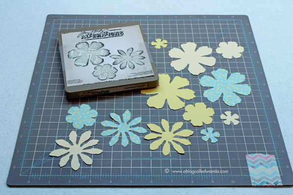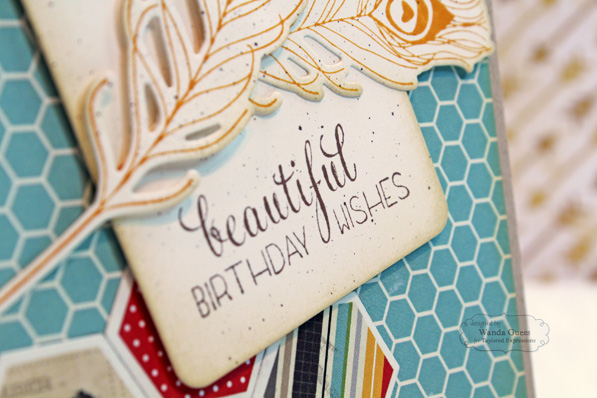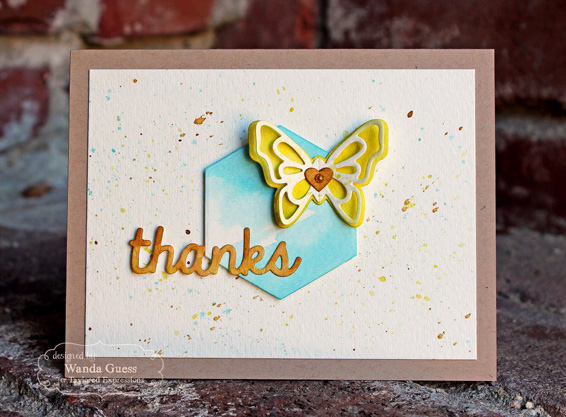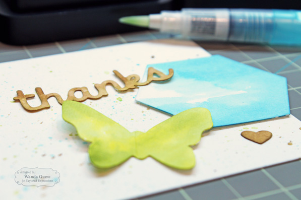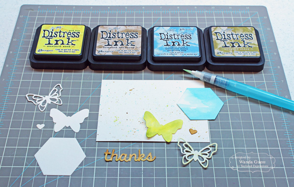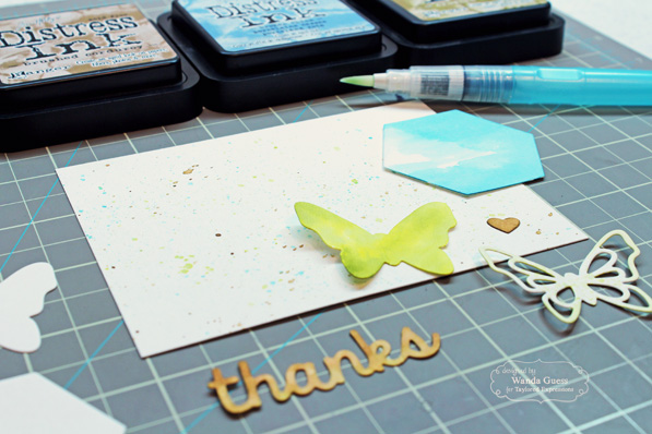 The Flutter-bys dies come with two pieces. I colored the solid one with the green Distress Ink and then flicked some spots on the top one in the same color. The hexagon was brushed with color again, with a very wet brush.