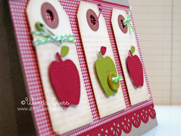 I hand made my own tags out of kraft paper and then embossed them with the 'Musical/Swirls' Impression plate. After I embossed them, I went over the swirls with a sponge and some white pigment ink to make them look snowy. This is a cool trick to "pop" the embossed parts of cards – use ink over them!