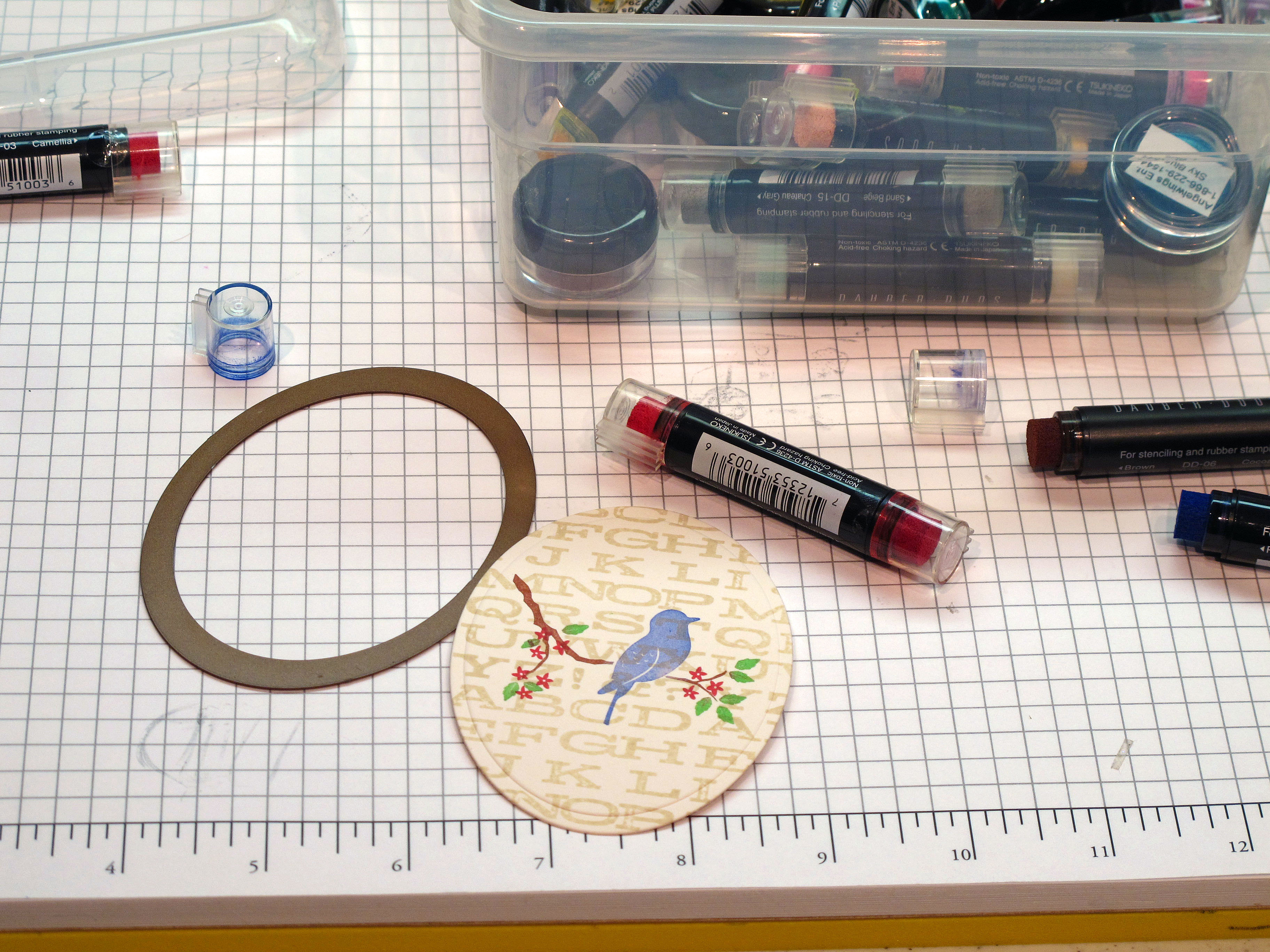 In this picture you can see I was coloring the sand at the bottom of the image, after cutting it into a scallop oval. If you look at my mat…you'll see the outline of brown with the "bumps." This gave me the idea for the clouds!