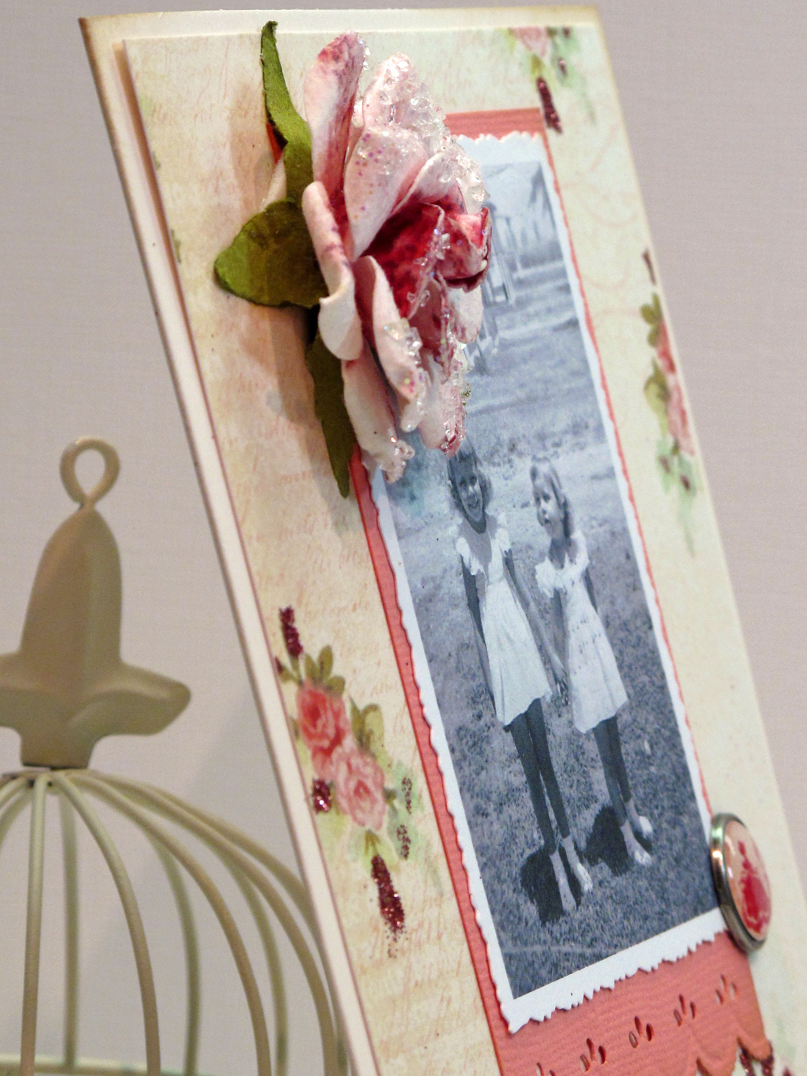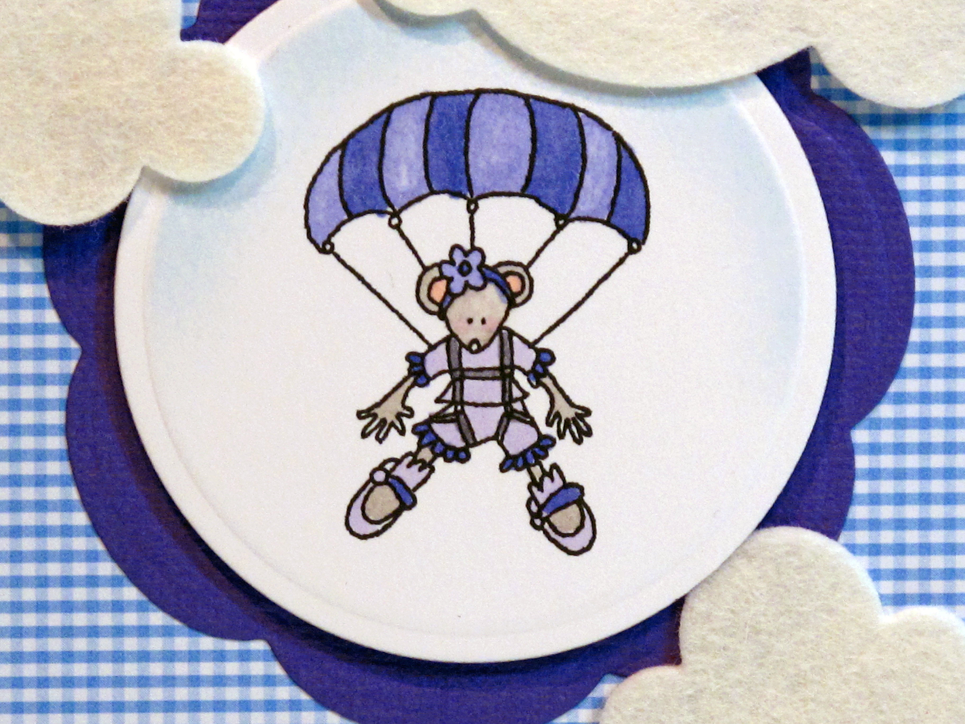 I masked the surfer girls and then cut out another scallop oval. Then I carefully stenciled on the clouds with light blue ink and an small sponge! I think it adds a nice touch! These were my final paper choices for each girl. The patterned papers and the neat flower embellies are from an old paper pack I got at Target. Remember when Target used to have cool scrapbooking stuff?