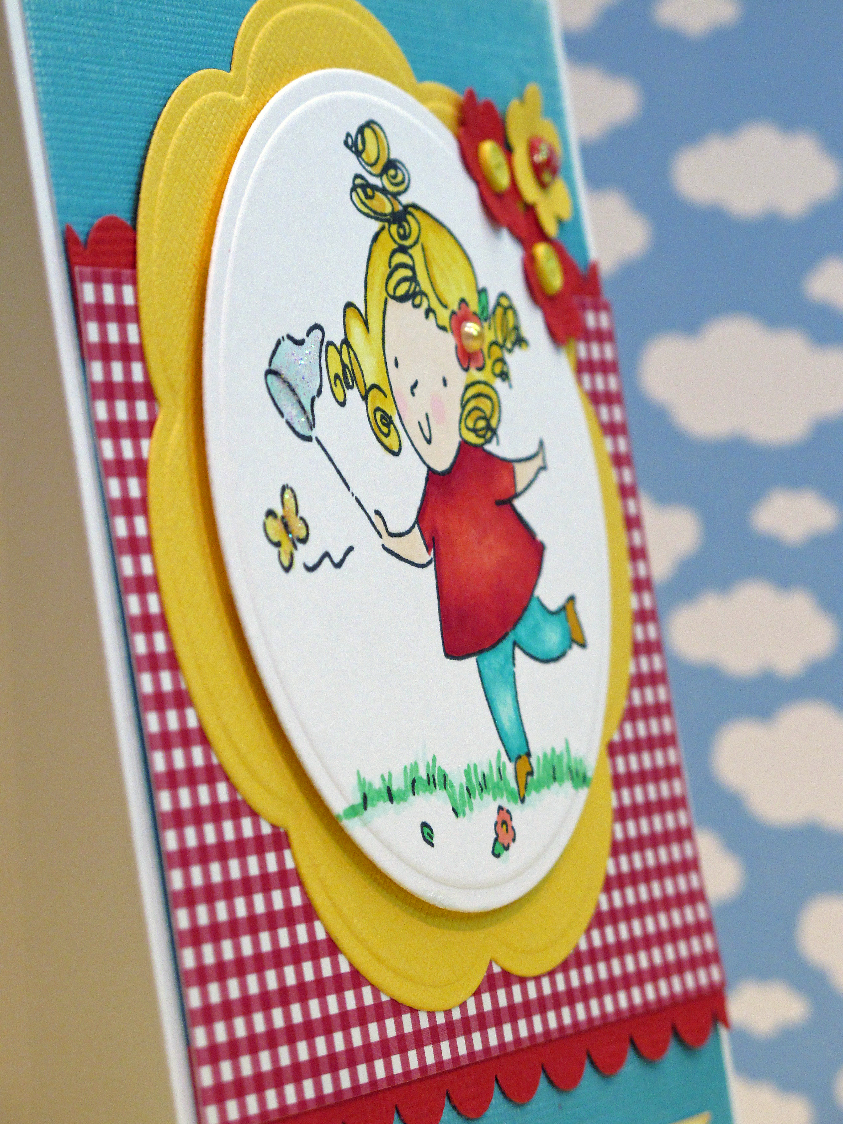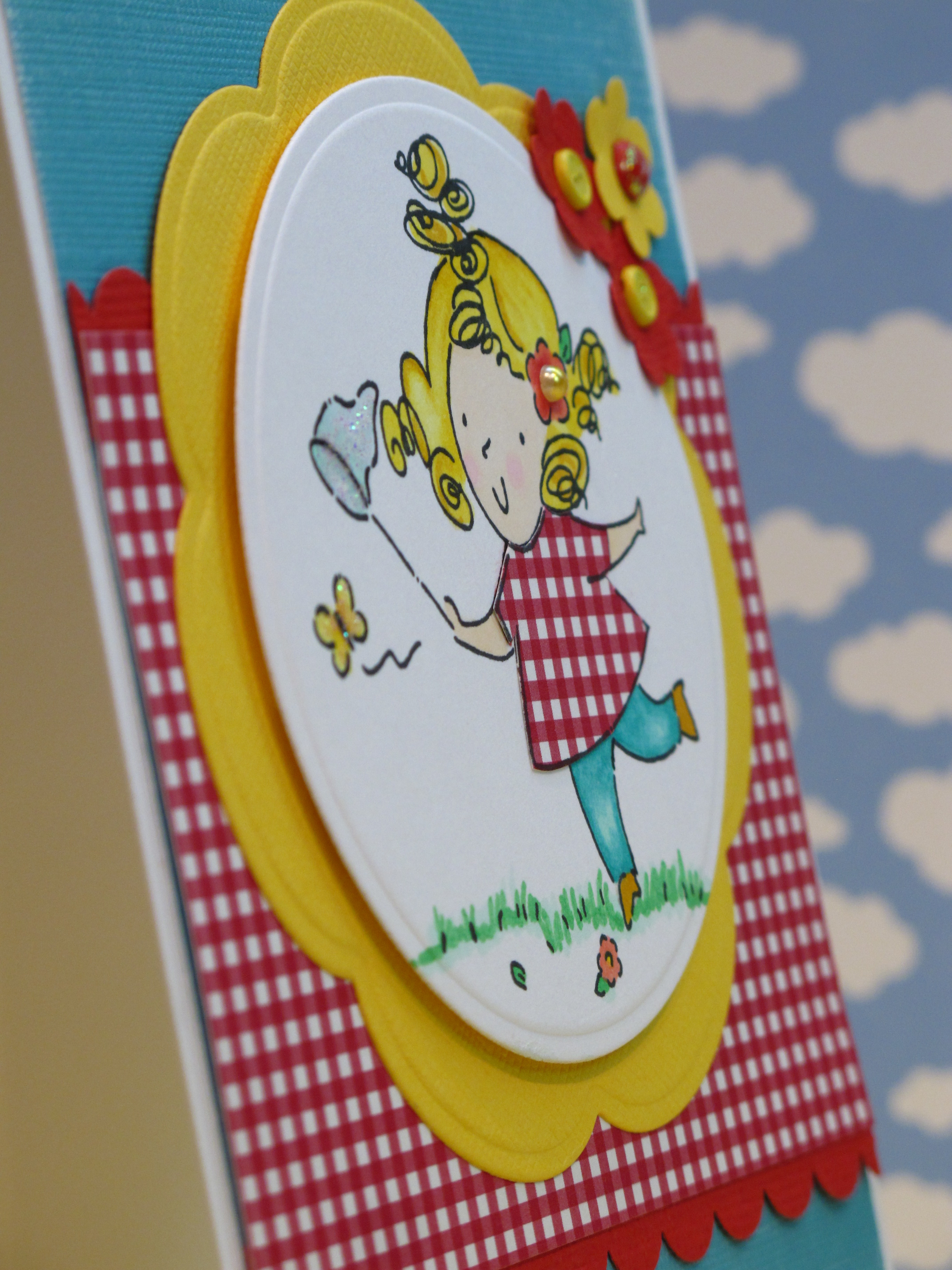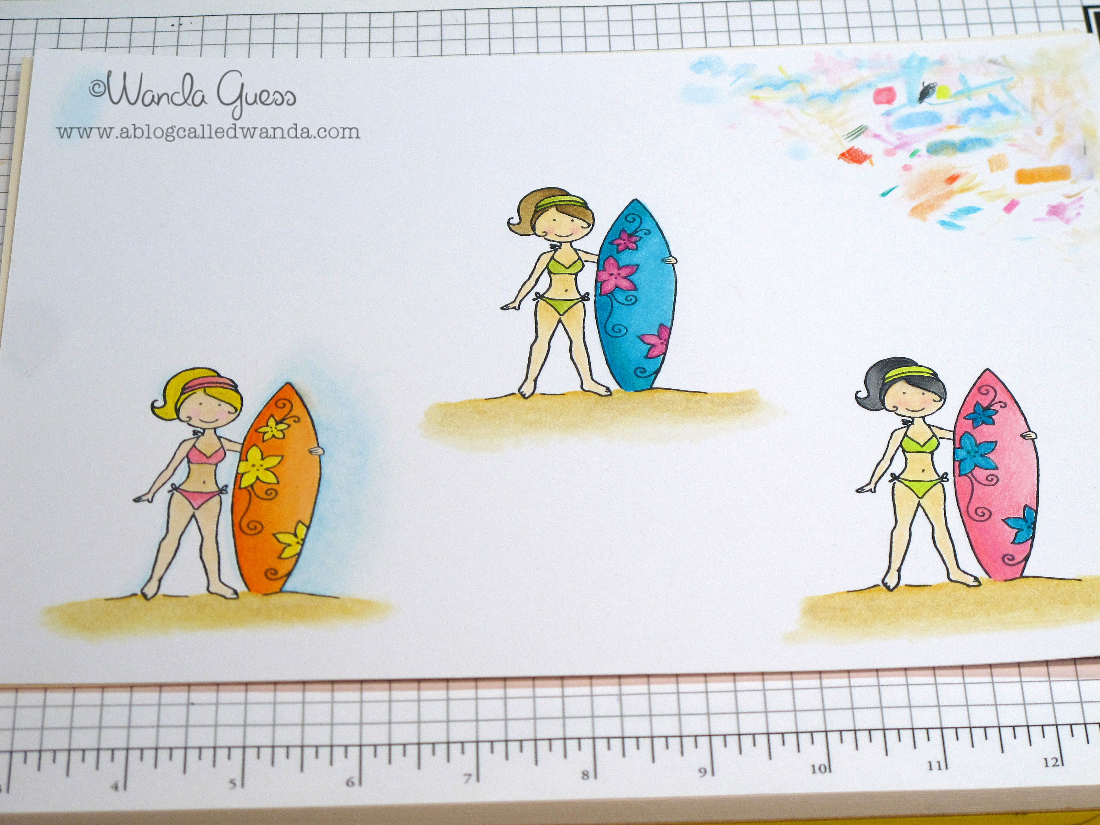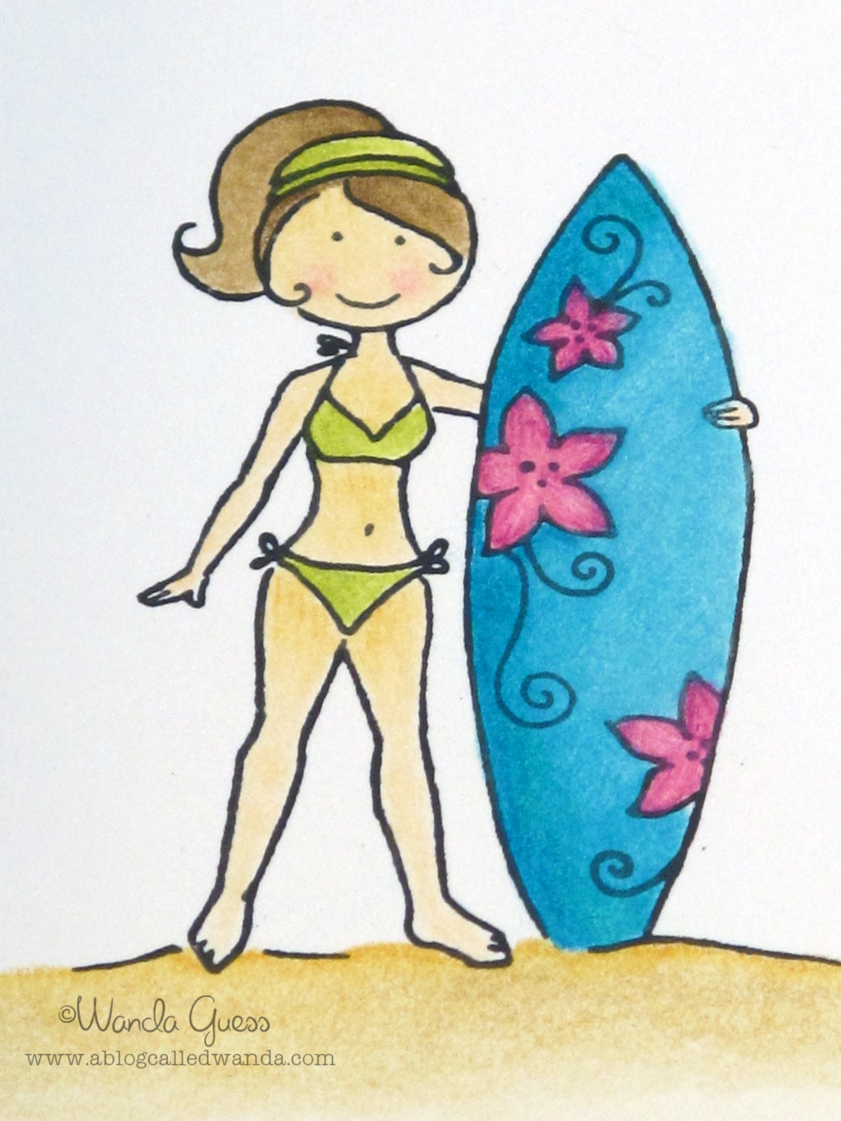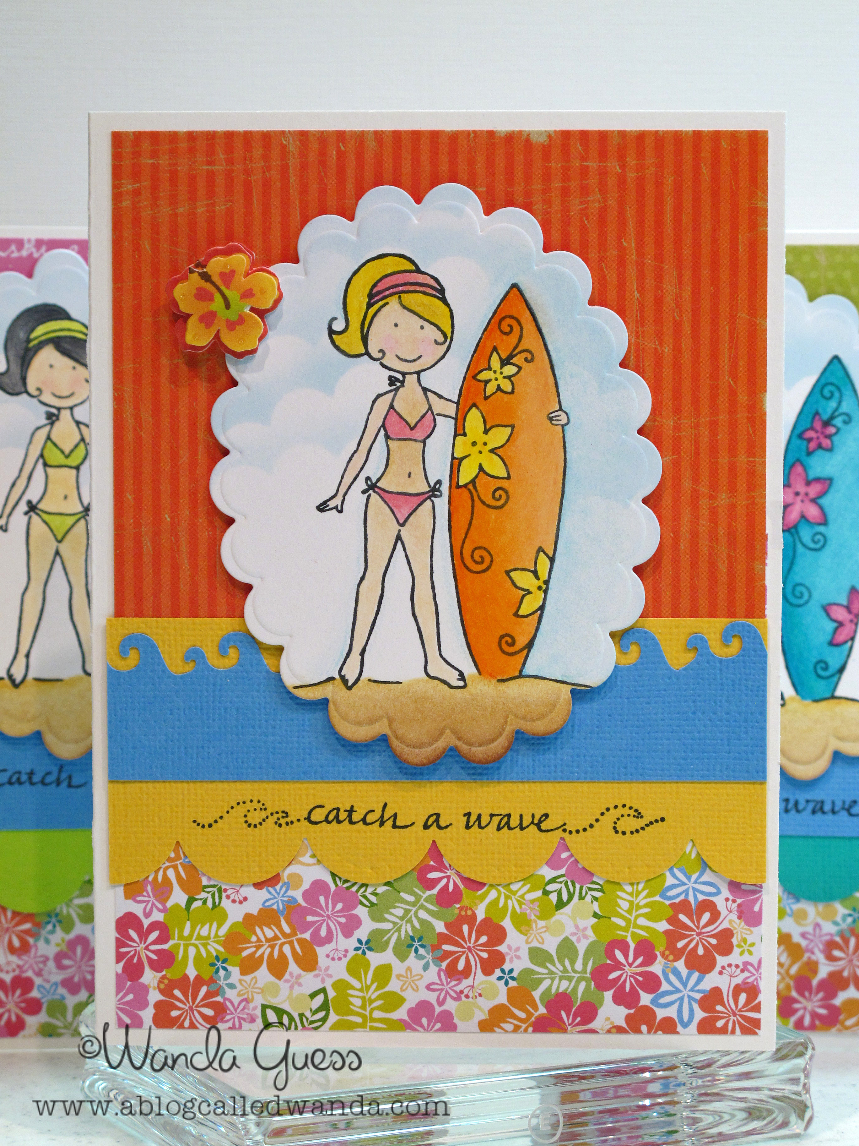 Okay, kids, this is it! The last post of Summmmmmer! I probably won't have time to post tomorrow and then Wednesday we're switching the old bloggy blog over to Fall. I made these cute cards last week and am finally getting around to posting them. it all started when dear, sweet Teadub gave me this uber cute surfer girl stamp from Elzybels! Then…three hours of coloring…then some FUN tropical paper…and here they are…surfer girl beauties!