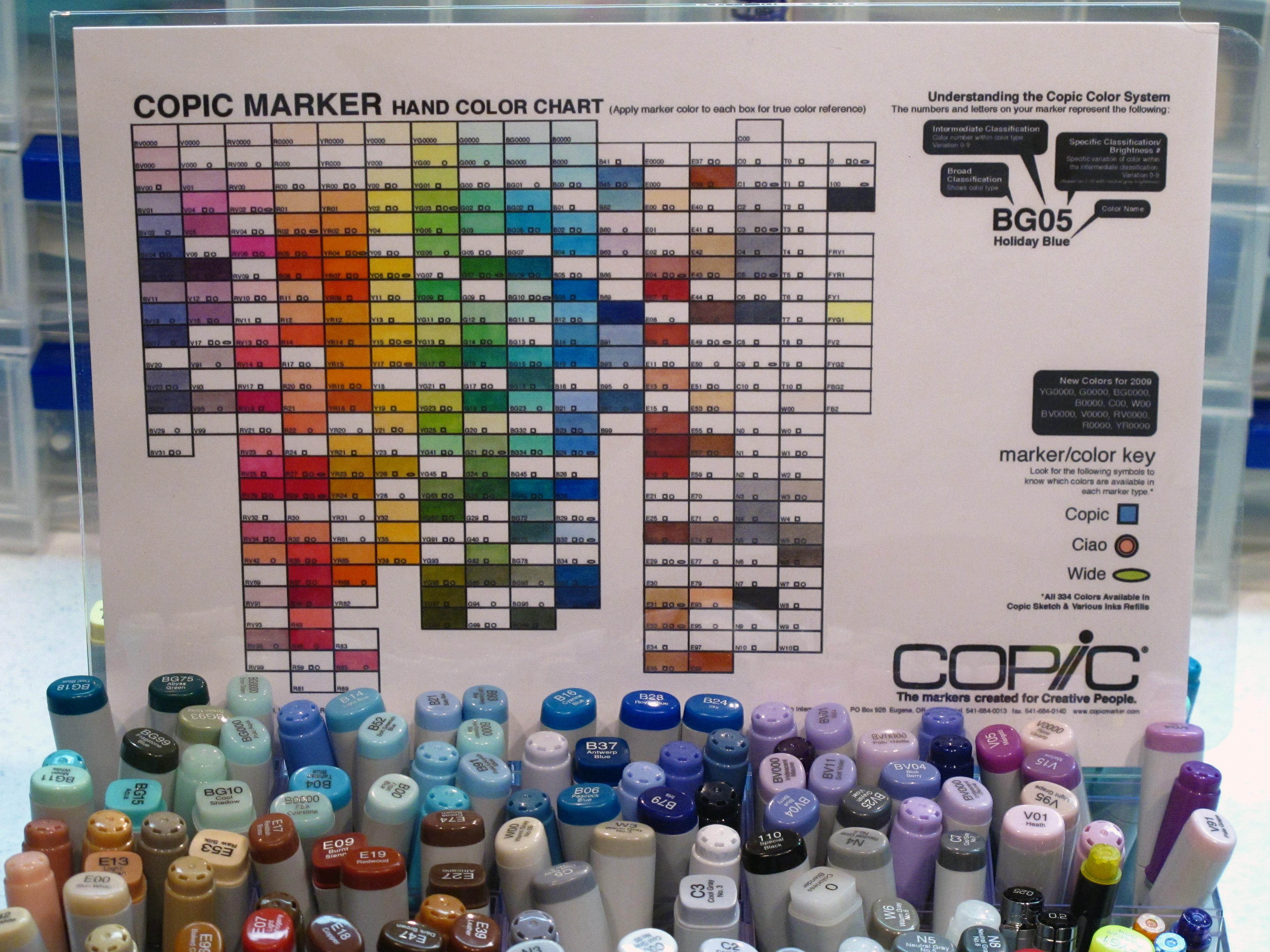 Copic Markers are alcohol based art markers from Japan. The Manga Comic Book and Anime artists use them for their incredible images. Do a google image search for Manga and you can see some of the amazing work they do! With markers! More and more local art stores and stamp stores are starting to carry them. They average about $5.50 each. They come in three different shapes with different tips. I prefer the oval sketch markers which have a brush tip on one end and a highlighter type tip on the other end.