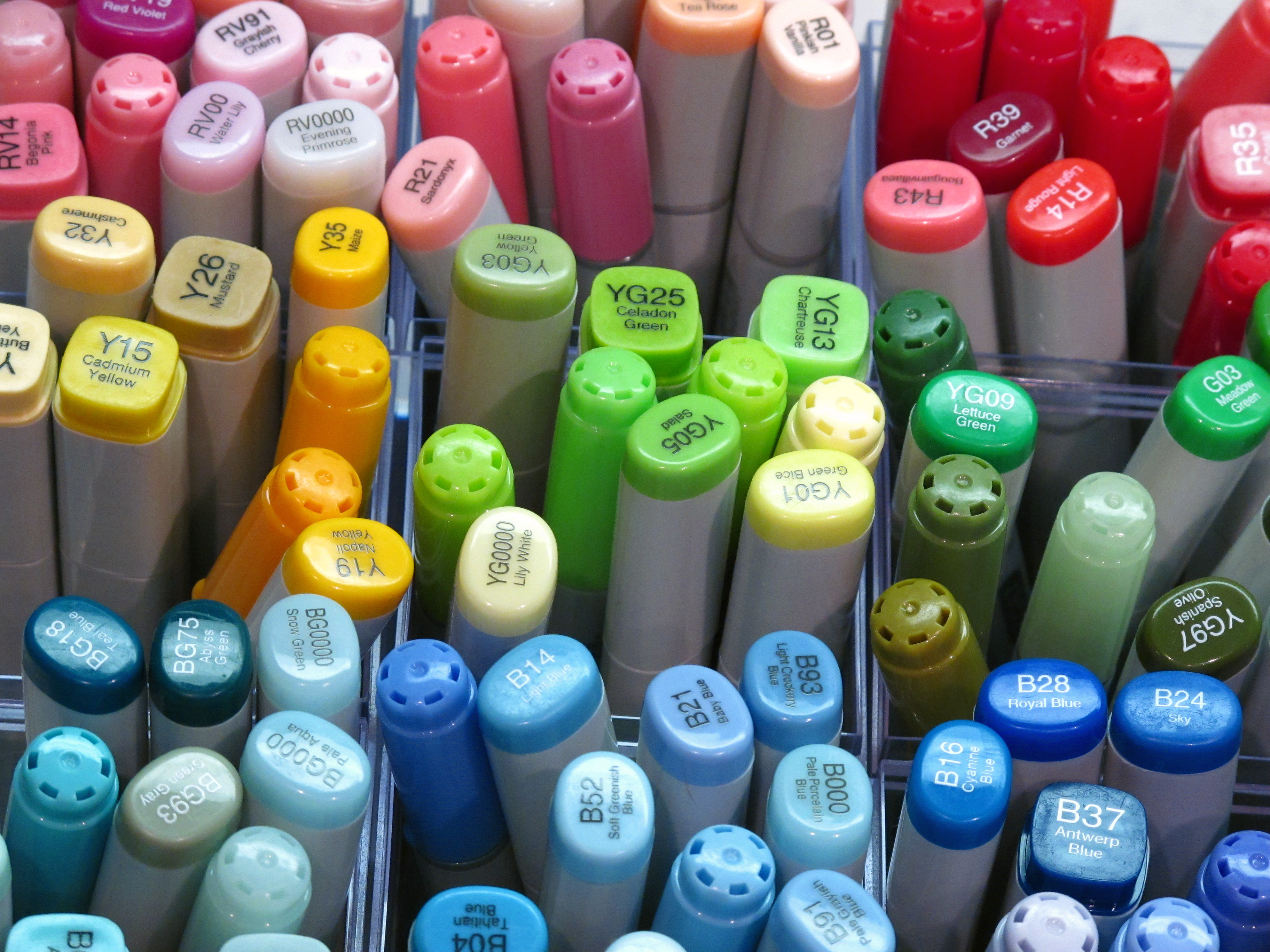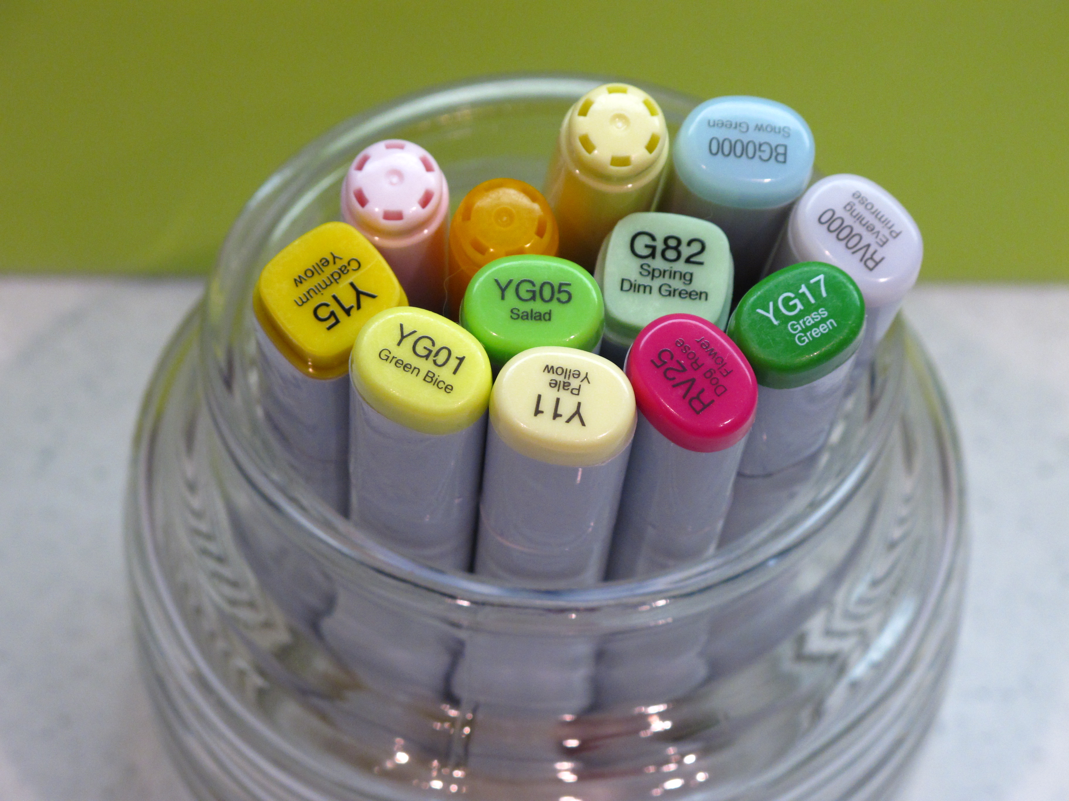 Copic Markers come in 350 colors. Yes, I said 350. (gasp). That is the best part! This makes it possible to blend 5-6 different shades of the same color together to get those real-looking results. The markers are labeled with a color name but also with color numbers to allow you to select the same color family for blending.