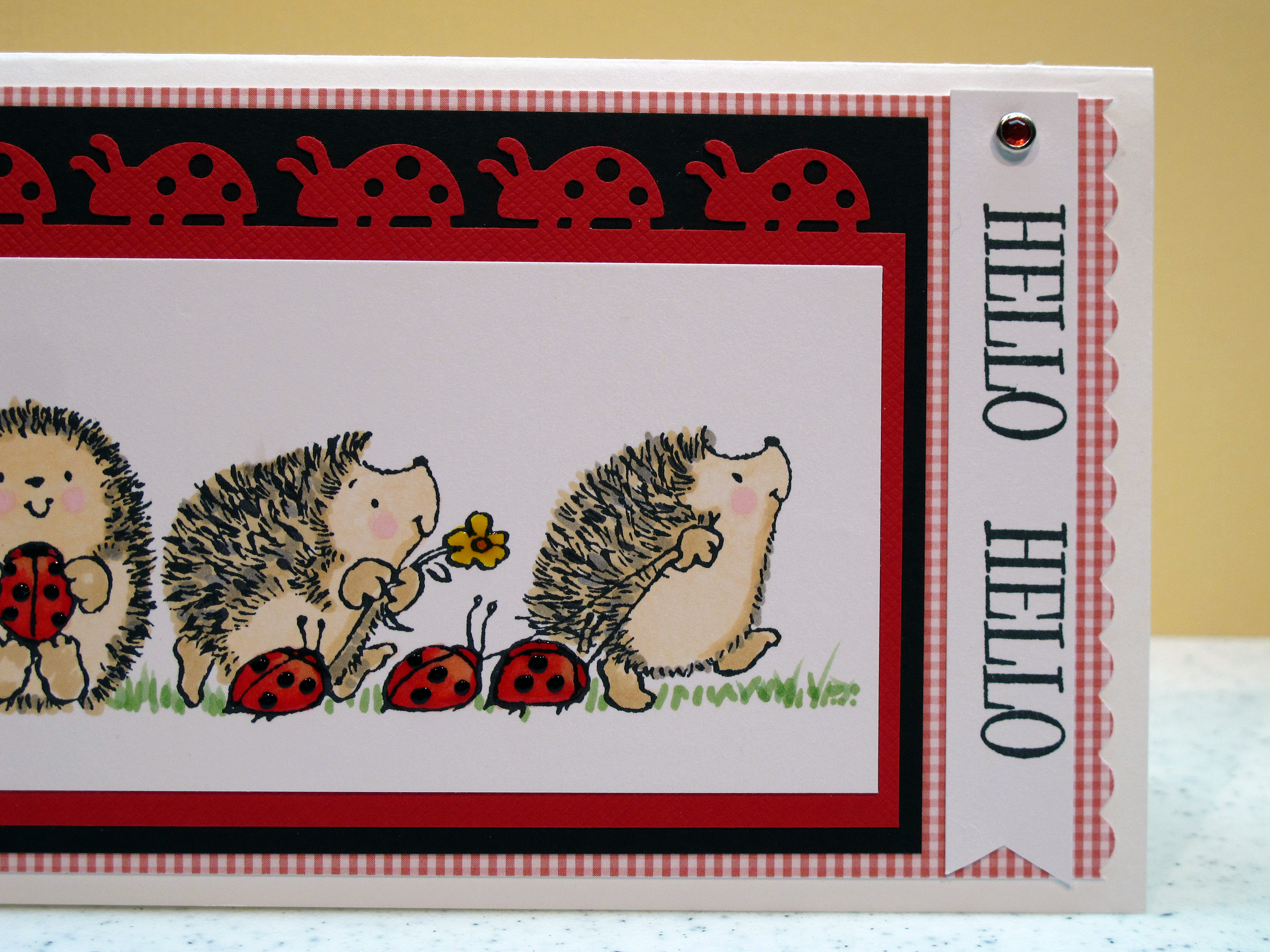 I used warm grey, cool grey, browns, and tans to make the hedgie 'fur' on top. Their faces and tummies are with a very very light red and some pink for their cheeks. The ladybugs are actually colored with two shades of red and a pink. The grass was not in the picture/stamp but I thought they needed to be grounded. I used three shades of green and drew it in. This is much easier than it sounds – really.