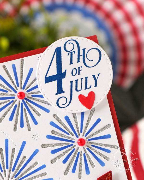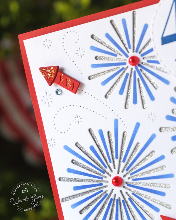 My third card today features the brand new Grand Finale dies along with the brand new Land of Liberty Stamp set (you’re gonna want this stamp set for sure!)… I used traditional colors of red, white and blue…. Then added pops of silver and glitter glue too. It’s bright! My finished care is a white A2 card base layered with red cardstock. Then I put down silver glitter cardstock – to show through the die cut fireworks. I die cut out the panel and also the fireworks and pinwheels. I used blue ink to stencil on the fireworks. Added my sentiment in blue and added a few gems and pearls. This die that cuts the large scene is so super detailed. Overall, it’s a party on a card!