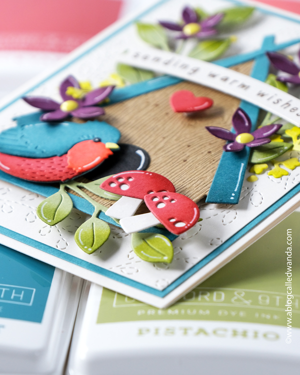 It was really fun to die cut the flowers and birds and mushrooms. I shaded each piece using the matching ink color and small sponge daubers. I added white gel pen accents and some new enamel dots.