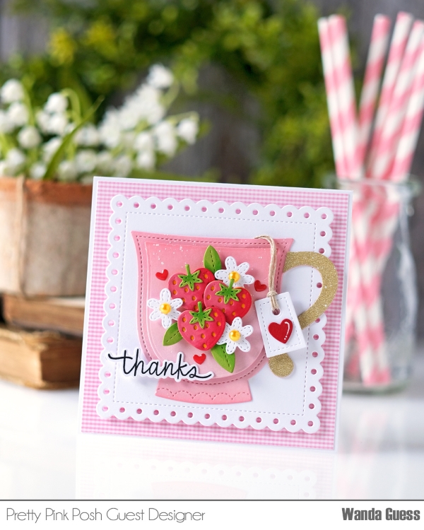 My finished card is a 4.75″ x 4.75″ square card. I wanted to use those pretty Eyelet Squares…. I layered pink gingham and then white, before putting on my focal point teacup. The teacup is the brand new Teacup Shaker Dies. I used past products to add the strawberries, flowers and leaves. This teacup die is the perfect size and scale for a card.
