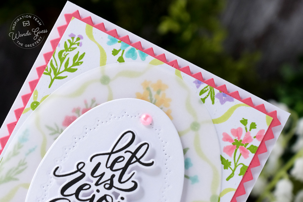 My final card for today features the brand new Bitty Botanicals stamps and the new Diamond Ribbon Stencils. This suite is SO lovely!! My finished card is a white A2 card base. I layered the Patchwork background die and then my panel. I wanted the flowers to shine, so I kept the rest of the card simple – a vellum oval and then a white oval with the beautiful sentiment on top. This card is clean and fresh! Those bitty botanicals are really pretty!! The sentiment was stamped and die cut from the matching die. This card could also be used for other occasions besides Easter.