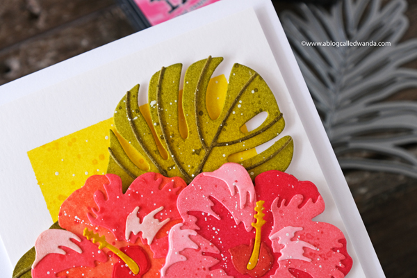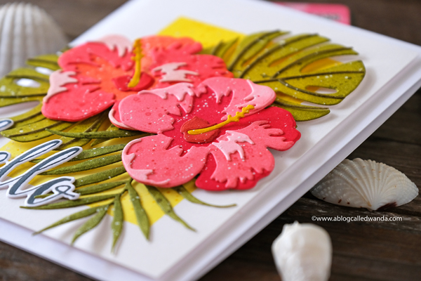 Here's a close up of the hibiscus flowers. Each flower is five die cut items. So it's really easy to color and assemble to achieve gorgeous results. One flower has a coral/orange base, and one has a deep pink base color. LOVE. I also am obsessed with the leaves that come in this die set!
