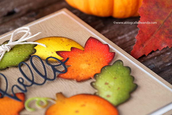 There really is no right or wrong way to do these leaves! Play. Have fun. Get dirty! Try new colors together! This part of the process was so relaxing and enjoyable. I love mixing colors. The leaves were arranged onto the card in a circle/wreath shape. A simple twine bow at the top to finish it off. I wasn't sure what to use for a greeting, so I used a pretty hello die cut. I think this would make a nice Thanksgiving card or any other type of Fall greeting.