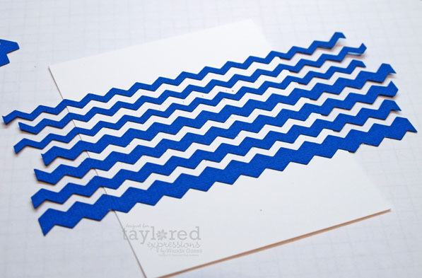 The new Chevron Die is a set of two dies….but actually you can get three different sizes out of it…because the piece in between the two makes another one! I cut out a bunch of bright blue chevrons and glued them to my white card layer. Then I cut them all at once to make it crisp on the edges.