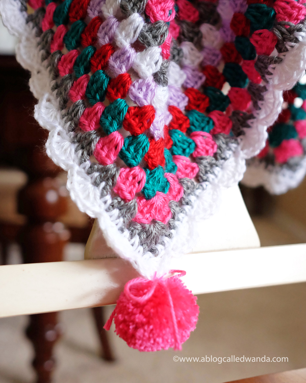 The pattern for my blanket is a Granny Square. It’s about 40×40 inches finished. But, the good part is you can keep adding rows forever! Make it whatever size you want it to be! I changed yarn color after every round. After I finished the square blanket, I added a shell stitch crochet border in white to polish/finish it off nicely. Then I made some pink pom poms for all the corners using my Clover Pom Pom Maker. I attached the pom poms with a tied bow, so she can remove them if they get in the way – or for washing.
