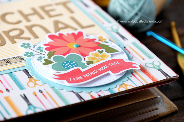 The journal is approximately 9×8 inches. It really is the perfect size! I started by covering the front of the journal with the scissor/ruler paper. Then I added everything else. The letter dies are from Taylored Expressions and I die cut them from some woodgrain paper in my stash. I used lots of the pretty stickers to decorate everything!