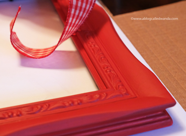 Here are all my framing supplies from Hobby Lobby! The paint color is Country Red from Deco Art’s Americana Collection. The ribbon is wired.