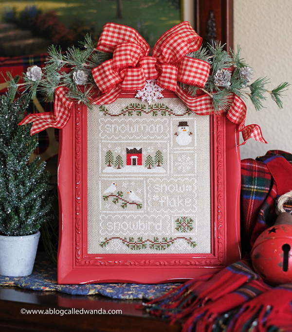 The pattern is called Snow Sampler and it’s from Country Cottage Needleworks. The fabric I used is Aida 14 in the color Raw. I used all the called for colors of DMC floss, except I made the house red instead of brown. This was a nice easy stitch and it came together quickly. All of the framing supplies are from Hobby Lobby. This is an 11×14 size frame.