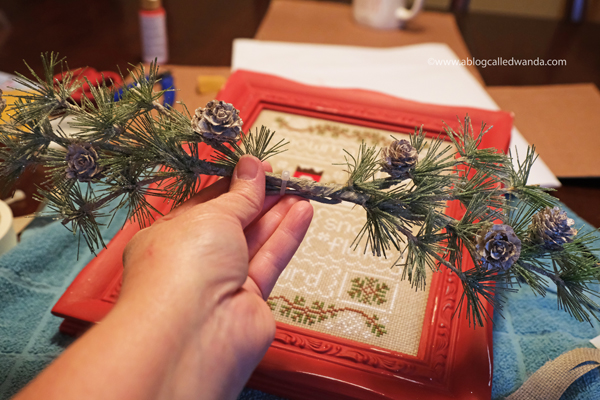 I used a zip tie to hook the two sprigs together and another zip tie to attach the bow in the center. A long zip tie wrapped around the top of the frame to hold it on. Tip: Never use glass with stitching because it needs to ‘breathe’ and will get discolored faster under glass. (I learned this while researching for the project!)
