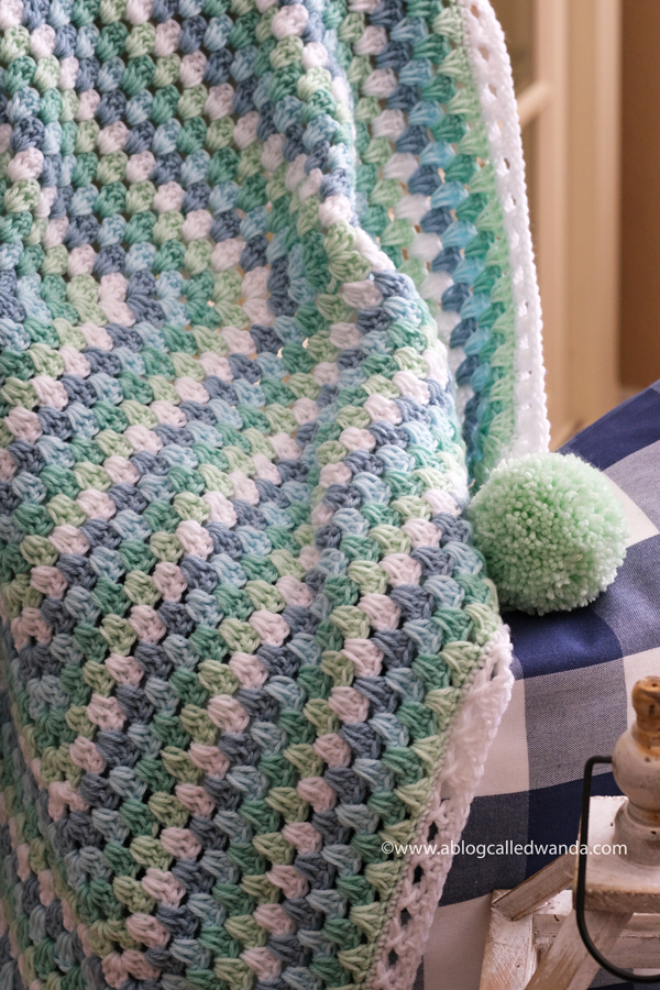 The yarn is from Hobby Lobby – I think they have the best baby yarn – in the prettiest colors. I linked all the supplies at the end of my post. I used a 4mm Hook size. The finished blanket is about four feet square. I made pom poms for the corners using that minty green yarn. They are tied on with bows so they can be removed for washing. Here are some pictures!! Take care and have a wonderful day!!