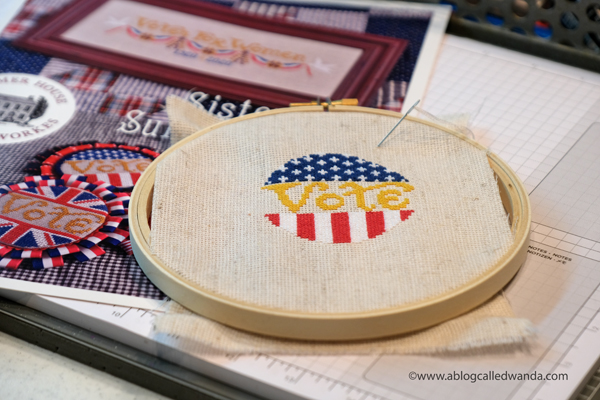 VOTE! Yes, I made a voting pin to wear on my jacket (or bag) for the next few days. The pattern is called Sister Suffragette and it has a large piece and then these small vote buttons (for several countries!). I will stitch the larger piece later, when I have time. I used 18 count Aida to make the piece small -ish. Supplies are linked below if you’re a stitcher and want to make this too!
