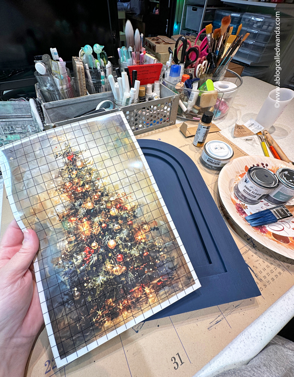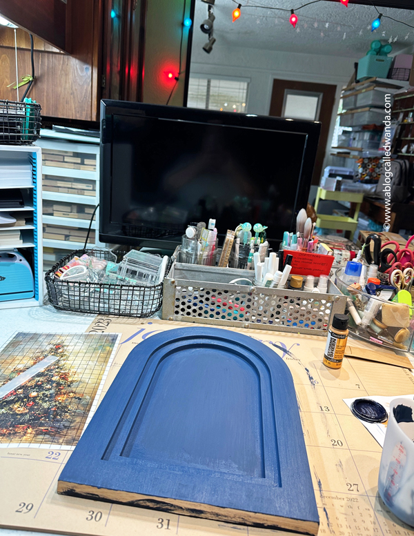 Here's another photo of my home decor painting piece – on our dining room table – in different light. It was a very hard project to photograph!!