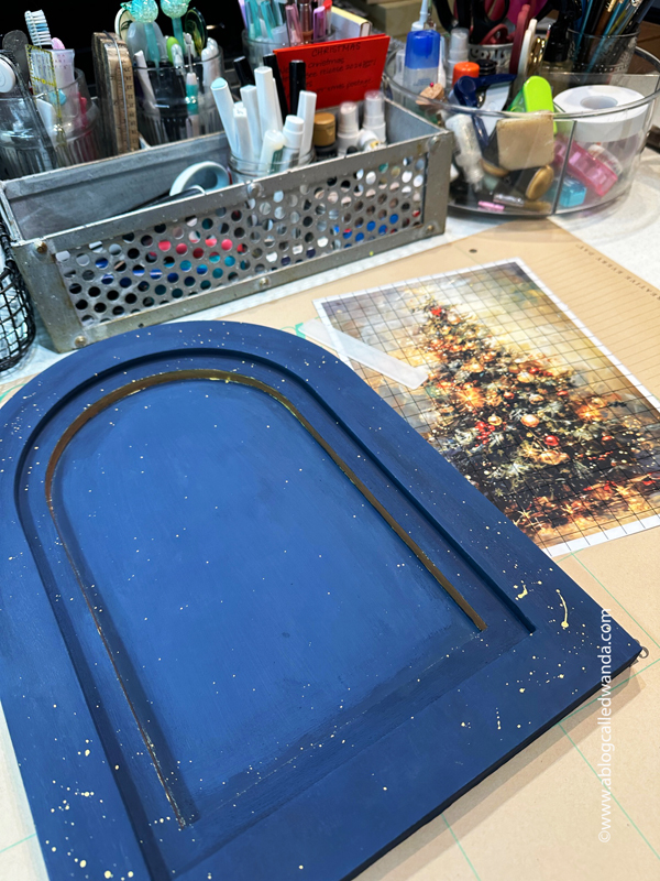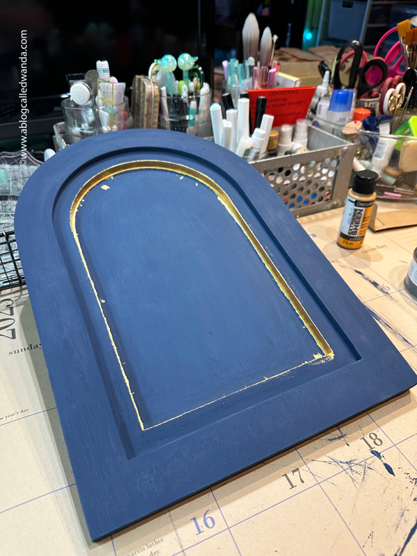 The piece is painted Navy (I combined two blues for a dark starry night color), and then I painted gold on that inside edge to look like gold leafing… I also splattered gold paint (of course). I used three coats of the blue paint and about five coats of the gold paint on that inside edge. The entire piece is coated in two coats of clear Annie Sloan Wax and then buffed out to a shiny finish. The tree is actually a giant rub on transfer! I cannot even tell you how pretty it is in person.