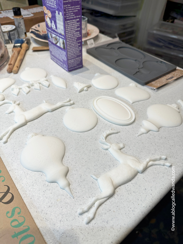 I also made these resin ornaments using my supplies from Iron Orchid Designs supplies also. The shapes were made using resin and then I painted 2-3 coats of deep charcoal chalk paint onto them. I used sweet woodland rub ons and then gold wax as shading. The ties for the ornaments are Tim Holtz velvet ribbon from my stash. These came out soooooo nice. I love them and can't wait to make more!!! I like to use the quick set resin so they set in about 10-15 minutes and then I usually let them sit until the next day before I paint them.