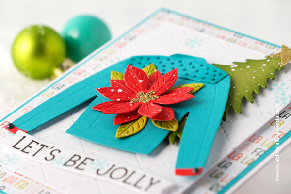 My finished card is an A2 white card base layered with Falala patterned paper and then a white panel to feature my jacket! I die cut a beautiful bright red poinsettia to adorn the back of my jacket… Oceanside and Poppy cardstock are great together!! I added some snowy paint splatters and bits of gold to finish my look. Let's be jolly indeed!! (I actually wish I had a denim jacket like this!) I added a tree and a sweet sentiment banner to finish it off!