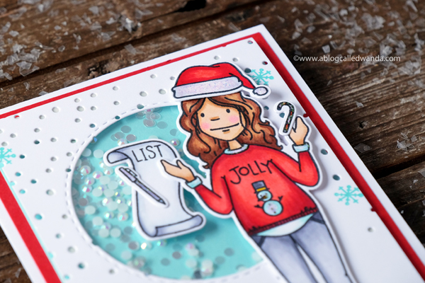 This next card is a fun Christmas card made with the new Holiday Shopper Lady! She is also me! I have been known to wear an ugly Christmas sweater and a Santa hat….and I always make lists! She is ready to rock and roll and shop til she drops! I used the beautiful new Snowfall Backdrop die and turned the card into a shaker card. FUN.