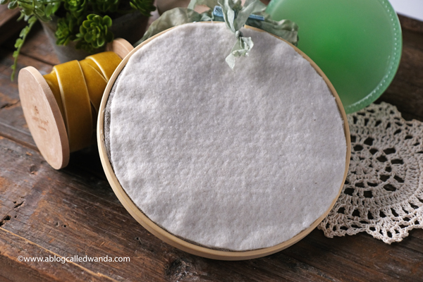 Here is the back – I finished it off with some natural cotton batting. It’s very soft so it won’t damage the wall if it’s hung. At the top is a pretty bow made with celadon colored crinkle ribbon that I dyed. It also has a ribbon loop for hanging.