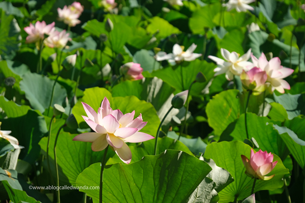 The Lotus Flowers are different colors from almost white, to half white and half pink, to bright pink. They are so beautiful! Try to imagine these flowers are about six feet tall!!! We caught the bloom in full glory and there were all stages of growth….