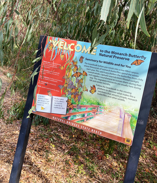 One of our day trips last week was to Santa Cruz. We live about 2 hours or so Northeast of Santa Cruz, so it’s an easy trip for us. I wanted to see the Monarch Butterflies that winter at the coast. They haven’t been here in a few years because of the wildfires and they are returning in good numbers this year. So that was the purpose of our trip that day! HERE IS SOME INFORMATION about the Butterflies and the place we went. We have a yearly State Parks Pass so we love to explore new California Parks. The butterflies are at Natural Bridges State Beach! The Monarchs come here for the winter because it is just the right climate. It is amazing because they cluster in the tops of the trees! It was a magical thing to see! The butterfly area is a short walk from the ocean!