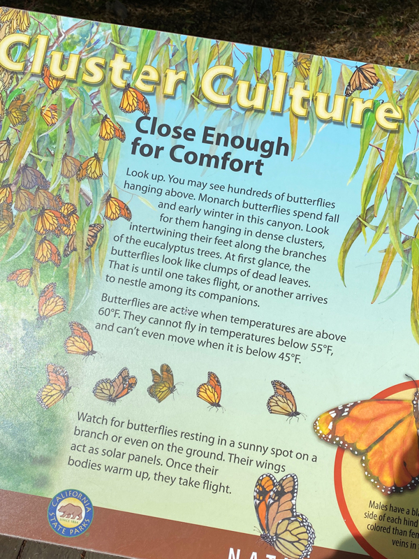 The butterflies come to a grove of eucalyptus trees that are down in a canyon. So you have to walk down into the canyon to see them. It’s so quiet and peaceful. And the smell of eaucalyptus trees is one of my favorite smells in the world. My family is from Monterey/Carmel area and my grandma’s backyard was basically a forest of eaucalyptus trees. And when they are wet from the fog, the smell is intoxicating. It brings back all the good memories for me.