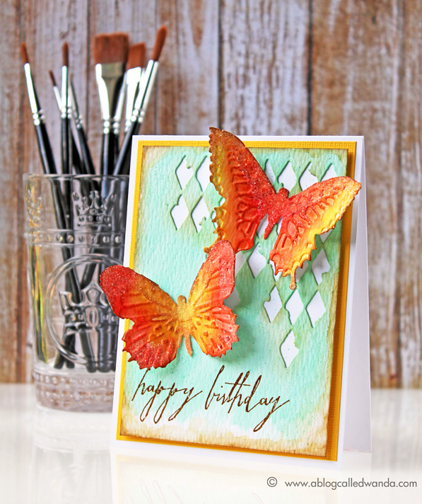 Those butterflies look so vibrant on the lovely, soft blue background. Love the texture of that BG paper, and how you left part of the edges without that blue colour. Stunning, Wanda, as always!