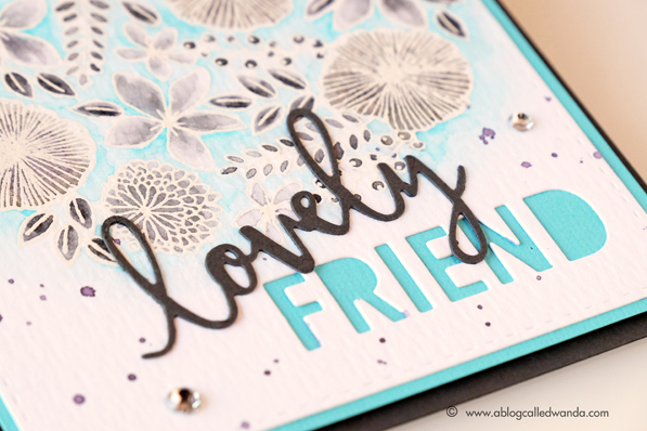 I used slate grey cardstock as my card base to for an elegant look. I used that same paper to die cut the lovely word out so it would all match together. I die cut the friend word and layered the top part onto the blue…. And then added ink splatters and clear gems!