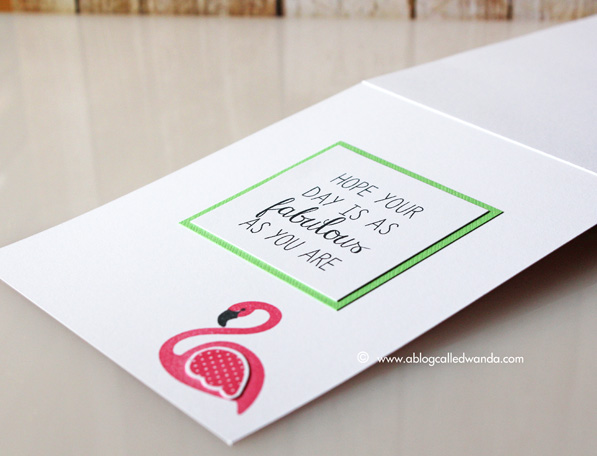 These flamingo stams ARE fabulous, don't ya think? They are perfection! For the front of my card, I forgot to leave room for a sentiment! So, I stamped parts of a larger sentiment to say "you are fabulous" and then stamped the entire sentiment on the inside. I kind of like how this 'accident' turned out! To do this, simply put washi tape over the parts of your stamp that you don't want to show, then ink it up. Remove the washi tape and stamp your words! Easy peasy!