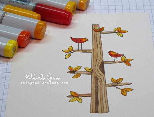 I used my trusty Copics in the classic Fall colors of orange, yellow and red. I made the little birdies red. Usually when I do this stamp, they are little bluebirds.