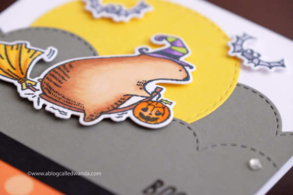Like, seriously, how adorbs is that flying bear??? So cute, and I see that he has his trick or treat bucket ready! Kind of reminds me of me! LOL. Same body shape!! I made some grey poofy clouds using the Mama Elephant Landscape Trio Dies (my go-to clouds) for him to fly in. I made a big bright yellow moon. The card base is white, in A2 size. I used a bit of patterned paper for the bottom because I wanted some orange in the card.