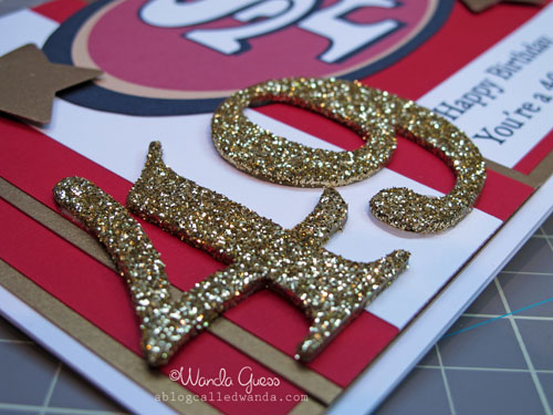 I printed the SF logo off the computer on high print quality on good cardstock and then cut it out. I wrote the sentiment on the computer as well. The rest was inspired by the team colors of red, gold and white.