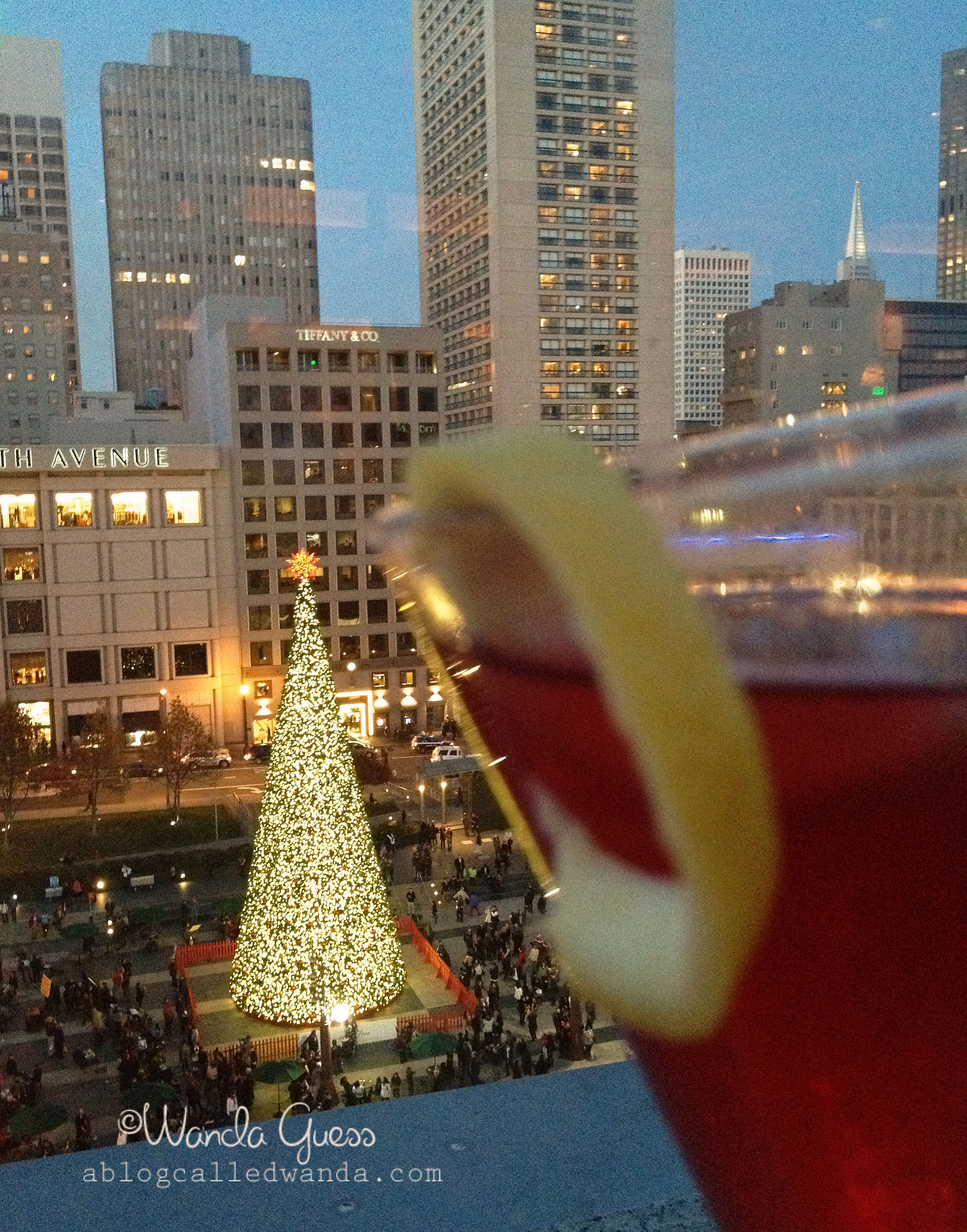 On the top floor of Macy's is a Cheesecake Factory restaurant that has outdoor seating. It's really the best view of Union Square, and we like to go hang out there and have a meal when we are shopping. Here's the view from our table down onto the square, with the tree and the ice rink. It was a gorgeous evening!