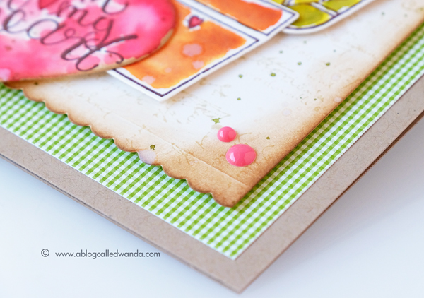 Here is a close up of that pretty die cut border, and my inking!