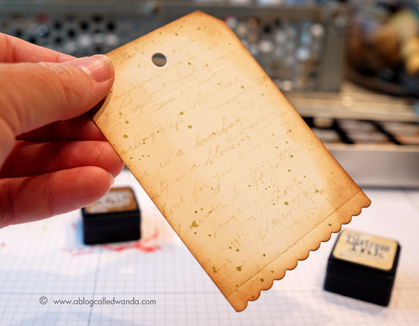 These beautiful tag dies!!!!! The tag set comes with the large tag (perfect size for cards or mini books), a circle for the reinforcer, and several border pieces for the bottom! Genius! I chose to use the small scallop border at the bottom of this tag. It was cut out of cream cardstock. Then I used the Dear Ruby giant background stamp and stamped the text onto it using Antique Linen Distress Ink. OOOH LA LA. This background stamp will easily cover an entire A2 card front! It's amazing. Then I speckled green and brown ink onto it, and edged it with Vintage Photo Distress Ink and a sponge. F-U-N!