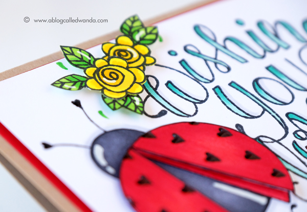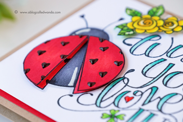 Oh, man, was this a fun card to make! Everything except the yellow flowers is one big stamp! Sized perfectly for the front of an A2 card! Brilliant! I made my card base out of kraft and added a layer of red to match the ladybug. I went to town coloring everything with Copic Markers (colors listed below). Even though this is a big stamp, the coloring went pretty quickly. I used happy and bright colors to make it pop. The writing is so beautiful…