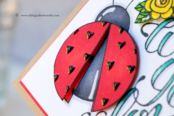The yellow flowers were attached with foam tape. For the writing I used two shades of aqua Copic markers for an ombre look. You can see that I outlined the ladybug and parts of the letters in C1 Copic Marker to add depth. This is a super easy trick!