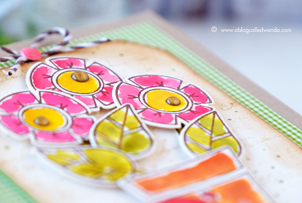 My next card for today is shabby chic vintage fun! I started with a Kraft A2 card base again and then layered some gingham paper for my bottom layer. All the flower images, the heart and the tag are all cut from cream cardstock instead of bright white. I used brown ink instead of black ink also. I water colored everything with Tim Holtz Distress Inks in some of my favorite colors using the mini ink pads and a water brush. This is one of my go to techniques! The flower stamp set has matching dies included in the package all together – I love that.