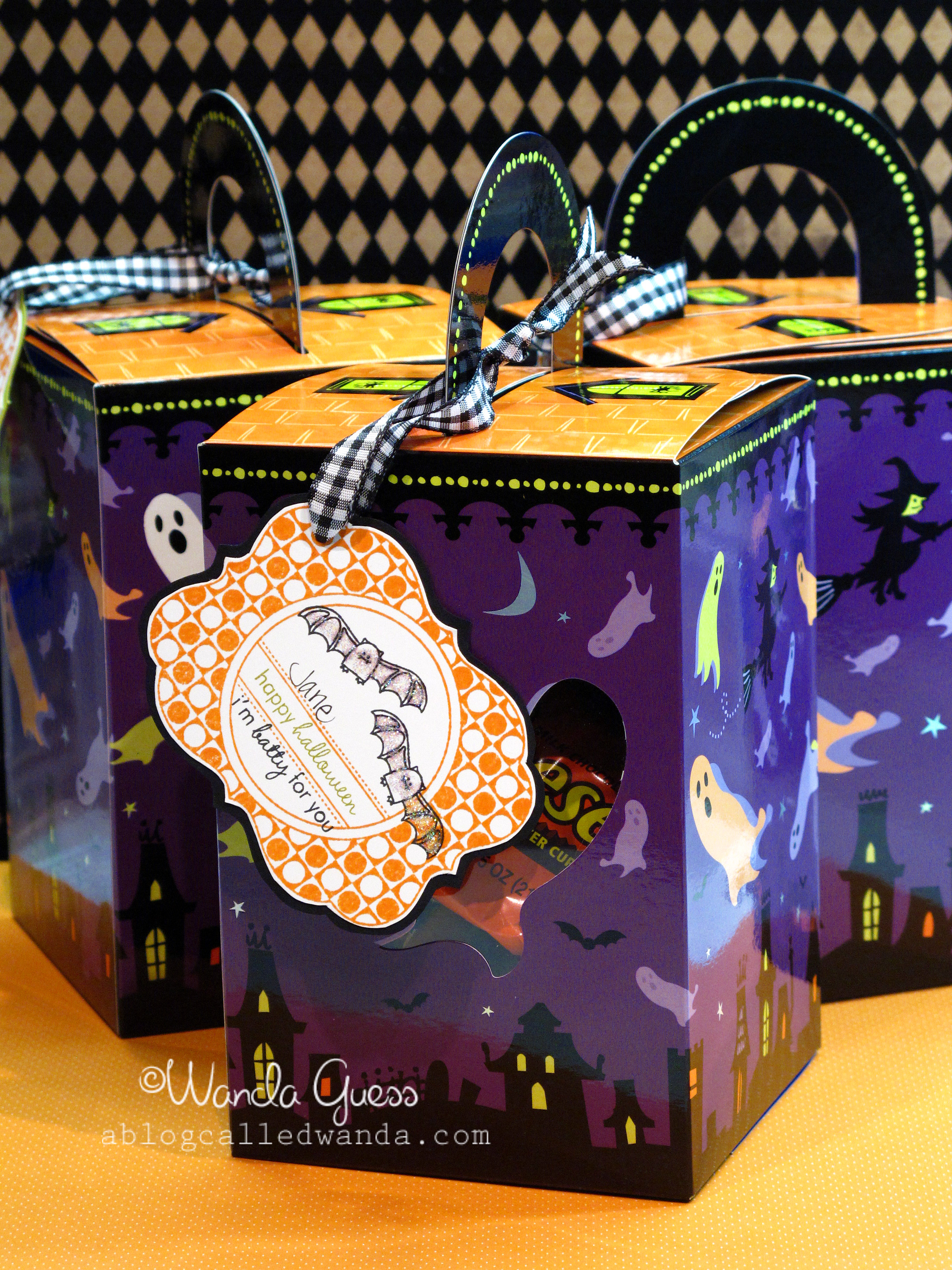 BOO! Are you having a good day? Getting ready for trick-or-treating? Finishing costumes? Eating candy? Whatever you're doing, hope you are having a great day. Not too much going on at our homestead. We don't really get trick-or-treaters at our house too much, but we have candy just in case. I think we'll just hang out. I have some treat boxes to share that I made for a few of my close friends and the DH. I didn't make them, but rather, just kind of put it all together. I did make the tags using the uber cute PTI Tiny Treats set!