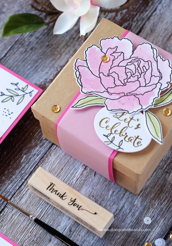 The favor box is from the big box crafting store and was inexpensive to buy. I like starting with a blank kraft canvas and then adding color! I coordinated everything with the beautiful Hero Arts Liquid Watercolors and bright pink and crisp white. For the box I stamped and die cut out the large peony and some leaves. I wrapped paper and vellum around the box and "sealed it" with the florals. You could put a small cake inside, or a present, or a note!