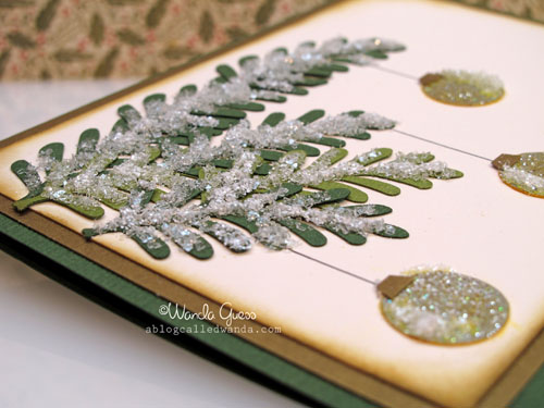 Well, I was wondering how you got such a thick layer of glittery goodness on your boughs! Wow! That is beautiful, Wanda! Clever use of your fern punch, too. Love the elegant and traditional holiday color palette and the natural elements mixed together. Really fabulous!