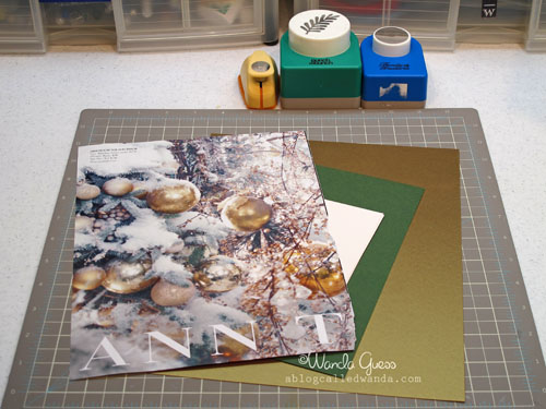 Here is the ad that I cut out of the magazine…Isn't it gorgeous? It's just green, white and gold…and tons of fluffy snow! I chose some burnished gold paper and a nice forest green paper for contrast. I ended up using glitter paper for the ornaments. I improvised my pine boughs with a fern punch!